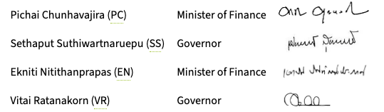 1. Pichai Chunhavajira (PC) – Minister of Finance Sethaput Suthiwartnarueput (SS) – Governor of the Bank of Thailand